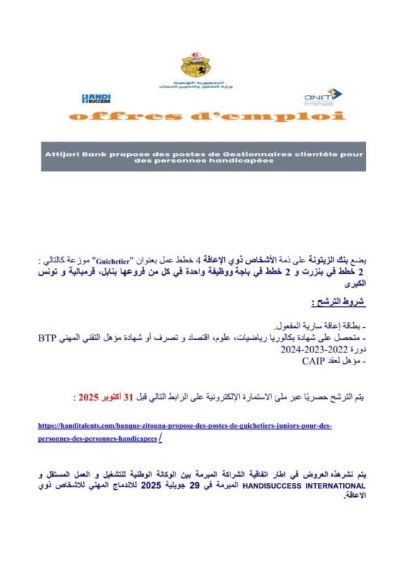 يتم نشرهذه العروض في اطار اتفاقية الشراكة بين الوكالة الوطنية للتشغيل و العمل المستقل و HANDISUCCESS INTERNATIONAL المبرمة في 29 جويلية 2025 للاندماج المهني للاشخاص ذوي الاعاقة.