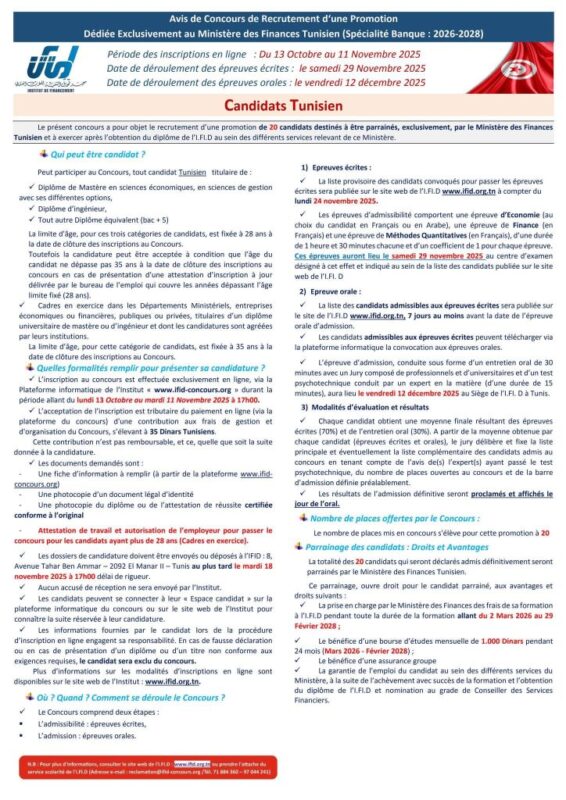 # 2025 # Avis de concours # banque # Concours # CONCOURS DE RECRUTEMENT # CONCOURS IFID # concours tunisie # IFID # Les # Ministère des Finances # pos # recrutement # Tunisie