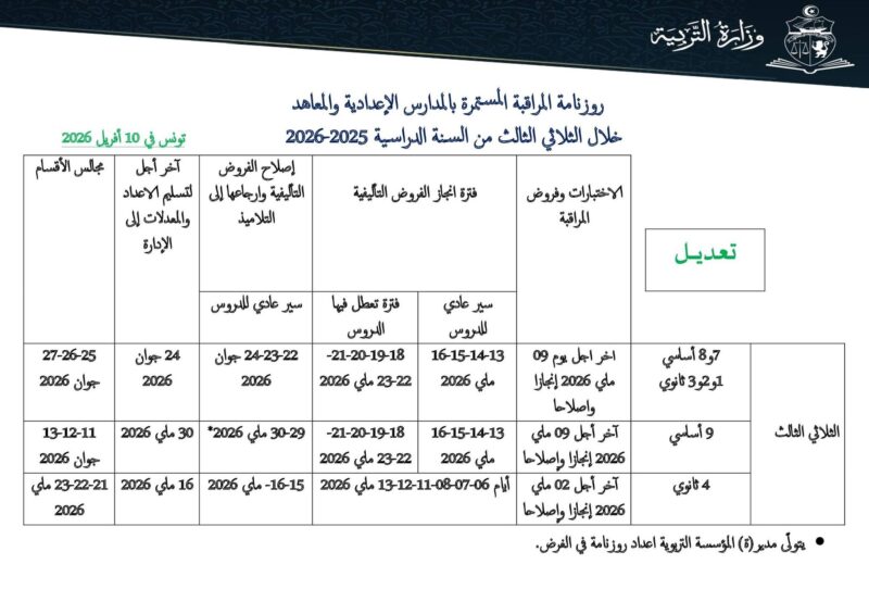 وأضافت أن آخر أجل لتسليم الأعداد والمعدلات إلى الإدارة ضُبط بيوم 16 ماي 2026 لتلاميذ الباكالوريا، و30 ماي لتلاميذ التاسعة أساسي، و24 جوان 2026 لبقية المستويات.