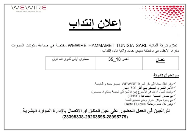 توفر النقل مجانا إلى مقر الشركة WEWIRE بسيدي حماد و النفيضة.